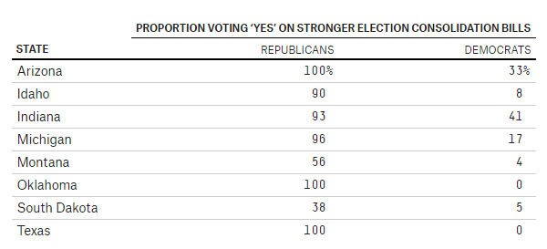 However, Anzia argues that Democrats support off-cycle elections. Anzia found that of the 102 bills introduced between 2001 and 2011 putting school board elections on the same day as other elections, 72 were sponsored exclusively or predominantly by Republicans while just 23 were sponsored by Democrats. Furthermore, Anzia’s analysis shows that party affiliation explained 40% of the variation in votes for or against consolidation bills, with Republicans far more likely than Democrats to vote in favor. For the political website 538, Yale political scientist Eitan Hersh reproduced a subset of Anzia’s data for what he deems to be “stronger” consolidation bills (excluding school board election bills, for example), underscoring the stark party contrast: