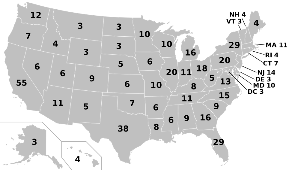 The figure below shows the breakdown of how many votes each state gets in the Electoral College as of 2019: