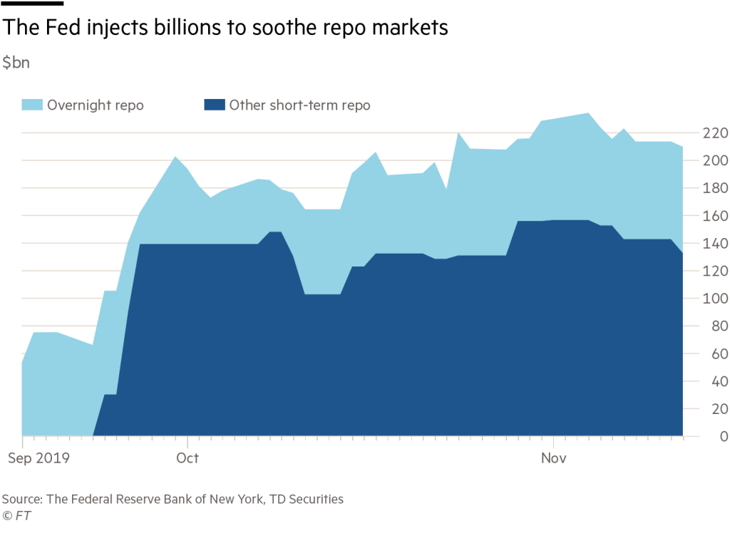 Repurchase agreements function similarly to short-term car title loans for consumers, except at a far lower interest rate. Banks in need of quick cash will temporarily sell their illiquid assets, i.e., securities like U.S. Treasury bonds, for cash from entities that have excess reserves, such as money market mutual funds, or other banks. The firm needing cash will sign a repo agreement to buy back its securities at a premium within a short window, typically the next day. The repo market allows banks to access quick cash for a small surcharge, and it enables entities with extra funds to turn a profit with low risk. The scale of the repo market is enormous: between $2 to 4 trillion of repurchase agreements are traded every day to ensure that banks and other entities can settle their daily transactions. Given the significance of the market, Wall Street and policymakers alike are concerned with the Fed’s unprecedented, ongoing actions to prop up the repo market that began in September.